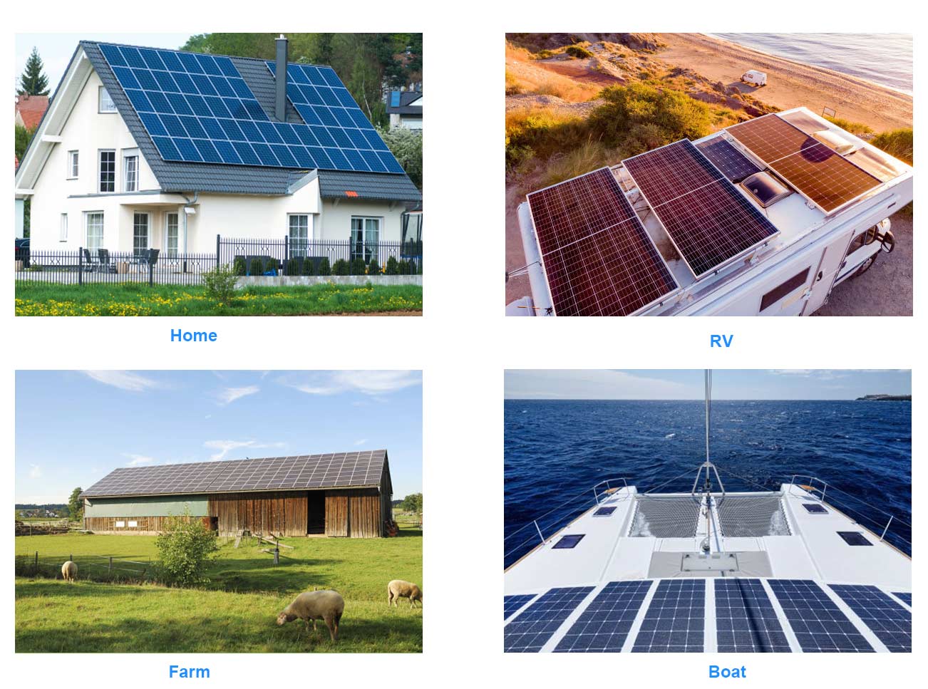 Solar panels can be used in off-grid environments including RVs, boats, sailboats, yachts, trucks, cabins, campers, tents, trailers, and golf carts for multiple uses with one panel.