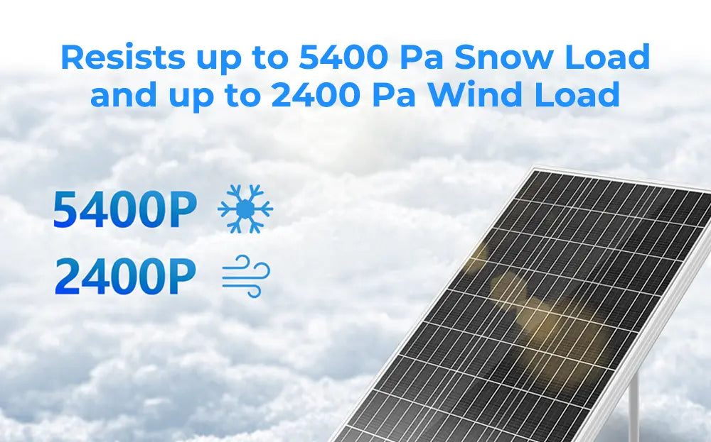 Our solar panels use corrosion-resistant aluminum frames, ensuring they operate under various weather conditions. They can withstand winds up to 2400Pa and snow loads up to 5400Pa.