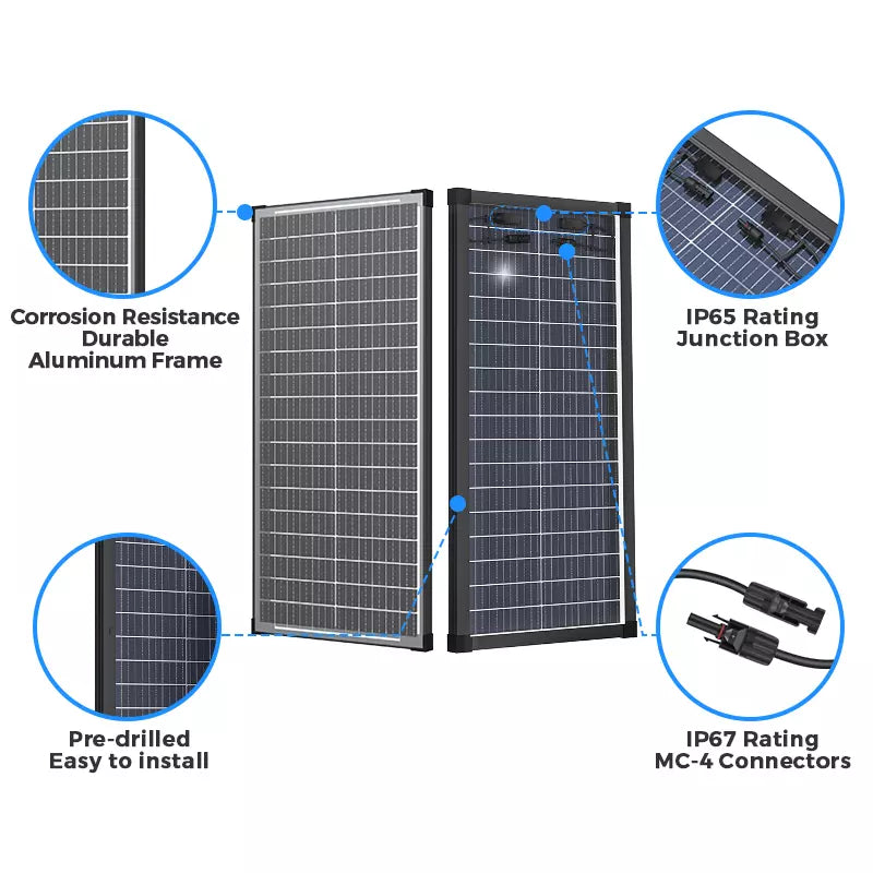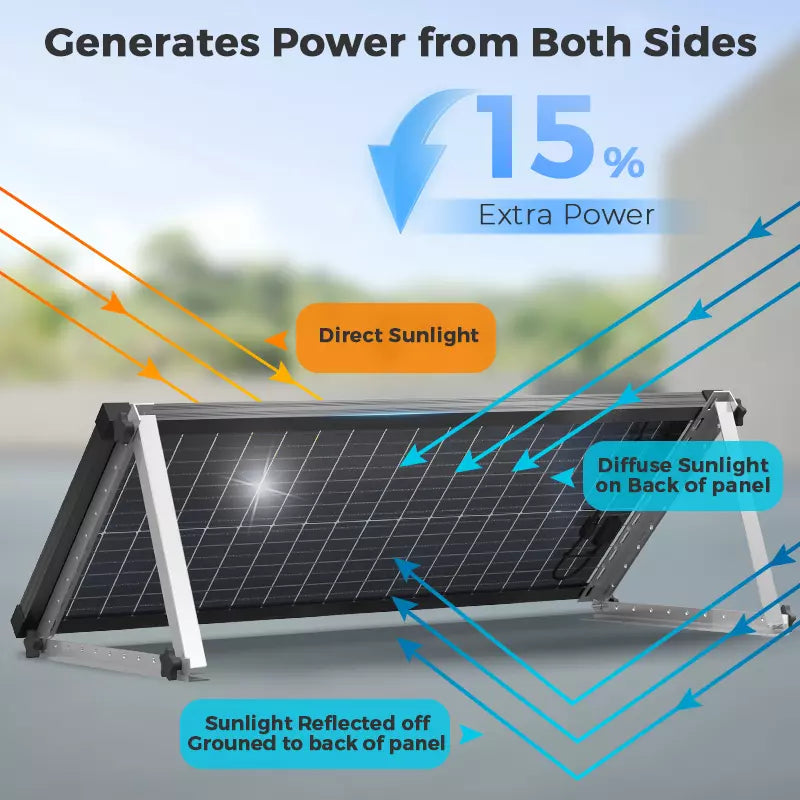 This product is a 4-piece 100W bifacial monocrystalline solar panel. They can be used in off-grid situations including RV, boat, sailboat, yacht, truck, cabin, camper, tent, trailer, and golf cart.