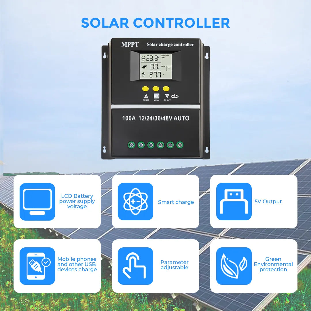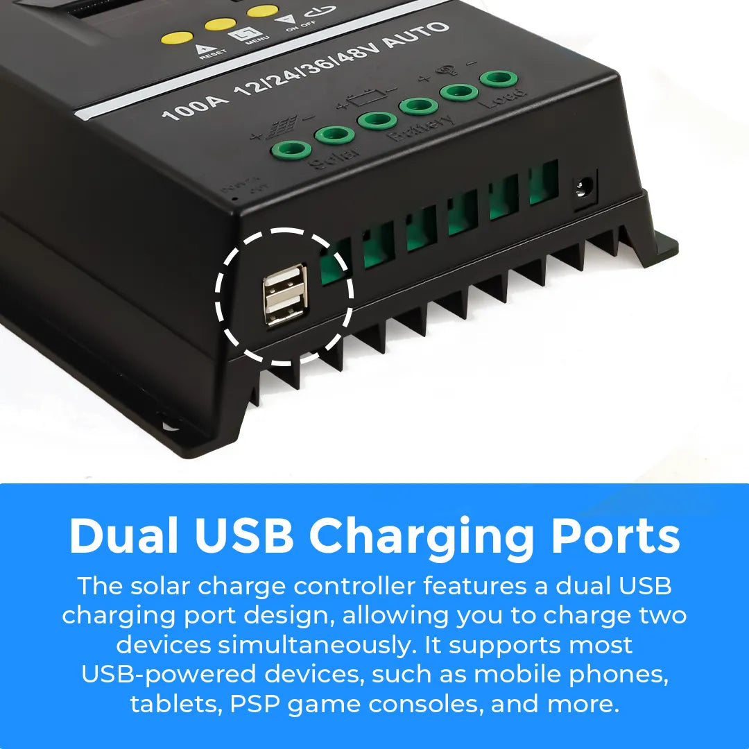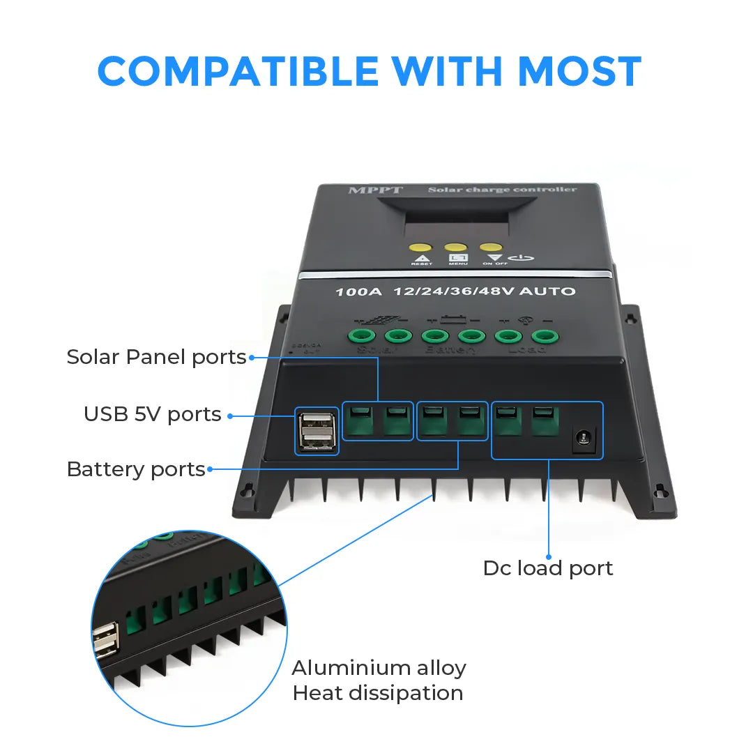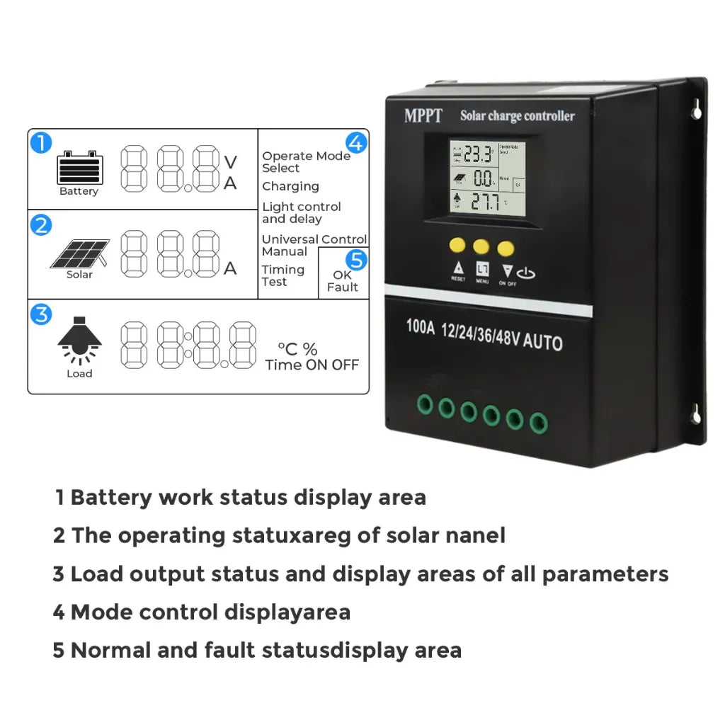 Werchtay 100A MPPT Charge Controller is designed for maximum efficiency, featuring up to 99% tracking efficiency to optimize solar charging and deliver more energy to your battery bank. It supports charging and discharging for various 12V/24V/36V/48V battery types, including Gel, AGM, Lithium, LiFePO4, Flooded, and NCM/NCA batteries, making it ideal for off-grid solar systems.